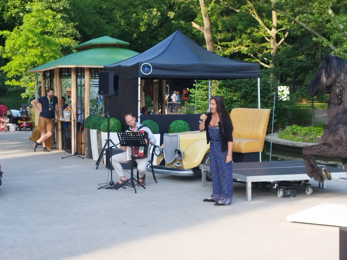 Természetesen kaptunk ízelítőt a művészek játékából is, vásári komédiával, énekes és zenés performanszokkal szórakoztatták a mintegy kétszáz jelenlévőt. Fellépett többek között Kránicz Richárd, Újhelyi Kinga, Lehőcz Zsuzsa, Mercs János, Takács Dániel pedig tangóharmonikán kísérte a produkciókat. Az üresjáratokban pedig a jelenlévők (főként gyerekek) egy-egy fénykép erejéig pózolhattak a színházi kellékekkel.