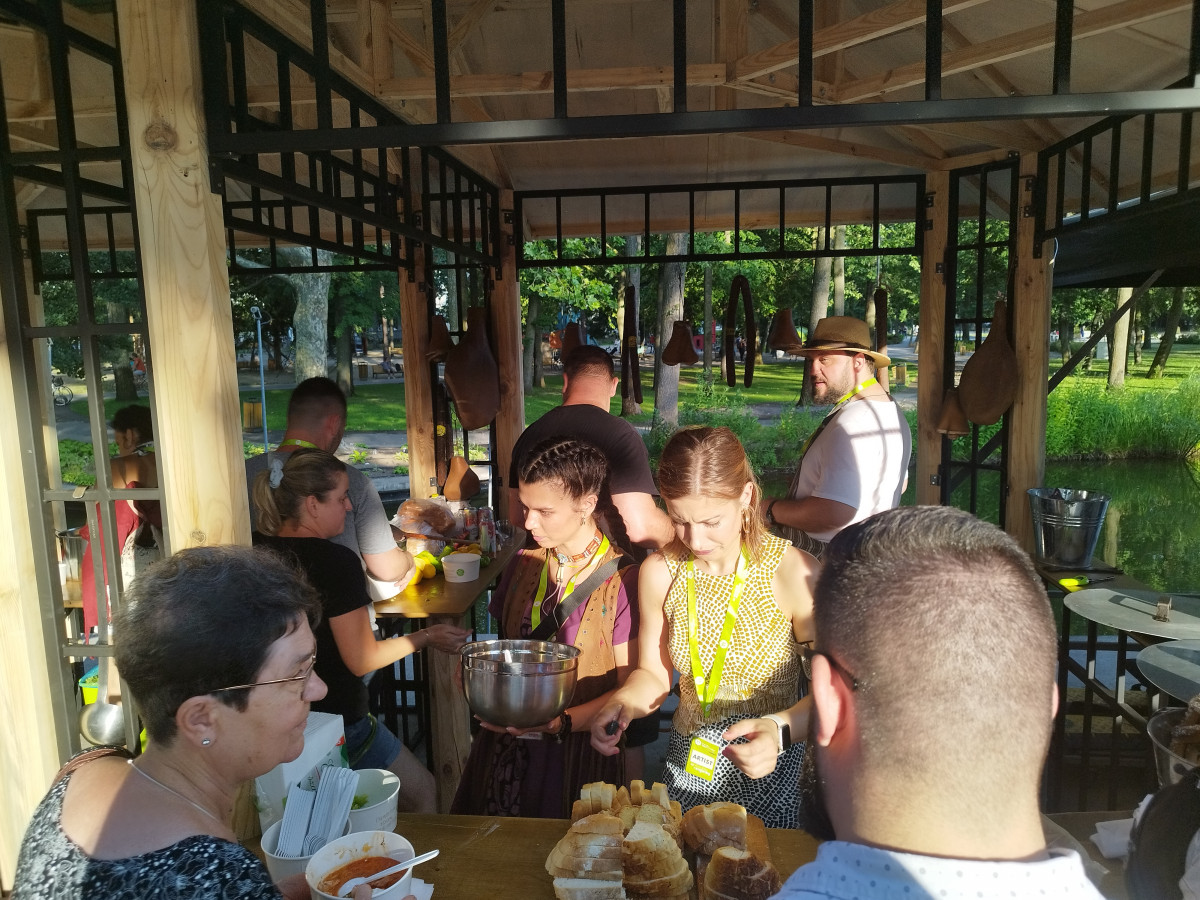 Szabó K. István később ígéretéhez híven kötényt ragadott, és egy igazi, hamisítatlan korhelylevessel lepte meg a vendégeket – ehhez igény szerint járt kovászos kenyér, házi tejföl és hegyes erős paprika is. Szomjoltó gyanánt rozéfröccs és szörpös víz várta a megjelenteket. A korhelyleves egyébként nagy siker lett, hosszú sorok kígyóztak a stand előtt, ahol osztották.