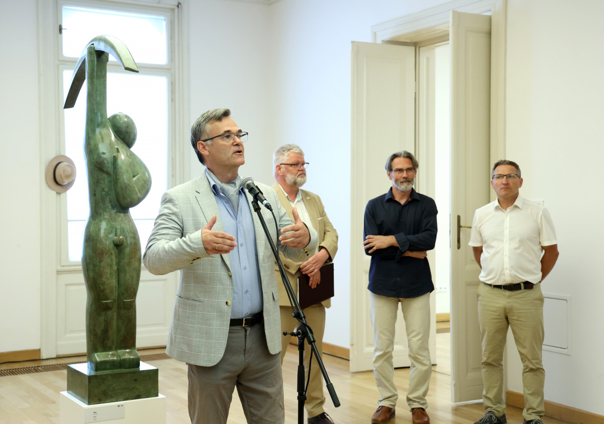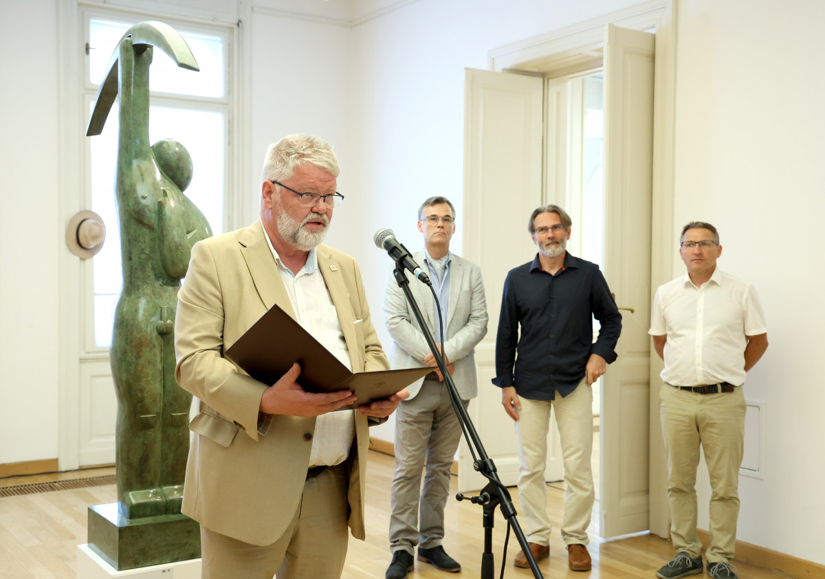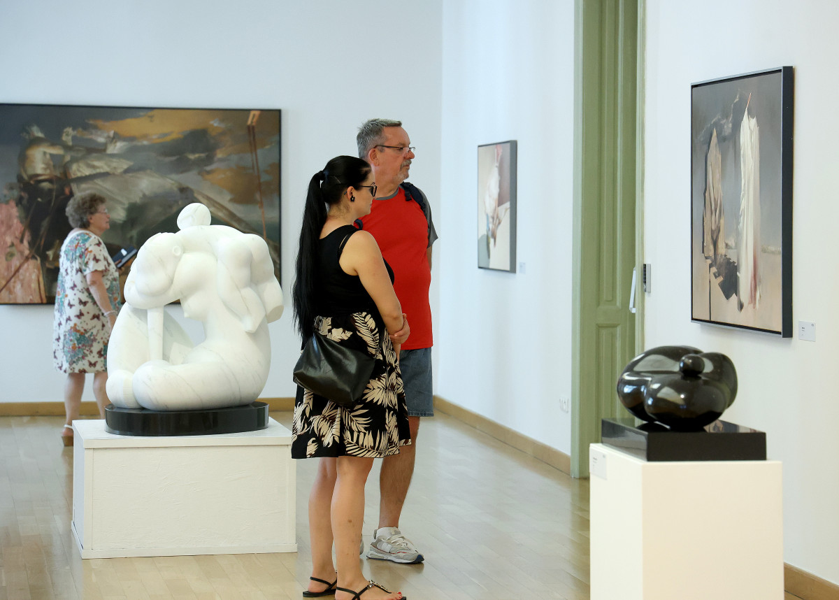 A két izgalmas életművel rendelkező, a képzőművészeti középgeneráció legerőteljesebb hanggal bíró képviselői közé tartozó alkotó nem először dolgozik együtt, ám a REÖK-ben való, nagyléptékű közös kiállítás új állomást jelent mindkettejük karrierjében. A Munkácsy Mihály- és Kossuth-díjas szobrász összetéveszthetetlen alkotásait már több ízben láthatták a szegedi művészetkedvelők a Nyári Tárlatok alkalmával. Magas szakmaiságú anyagkezelés jellemzi carrarai márványból vagy saját, egyedi eljárásával megmunkált, bronzból öntött szobrait, amelyek letisztult, lekerekített, alapformákból építkező mégis összetett formavilággal ábrázolják, rendszerint az emberi testet, testeket, gyakran a kontaktus változatos lehetőségeit tematizálva.