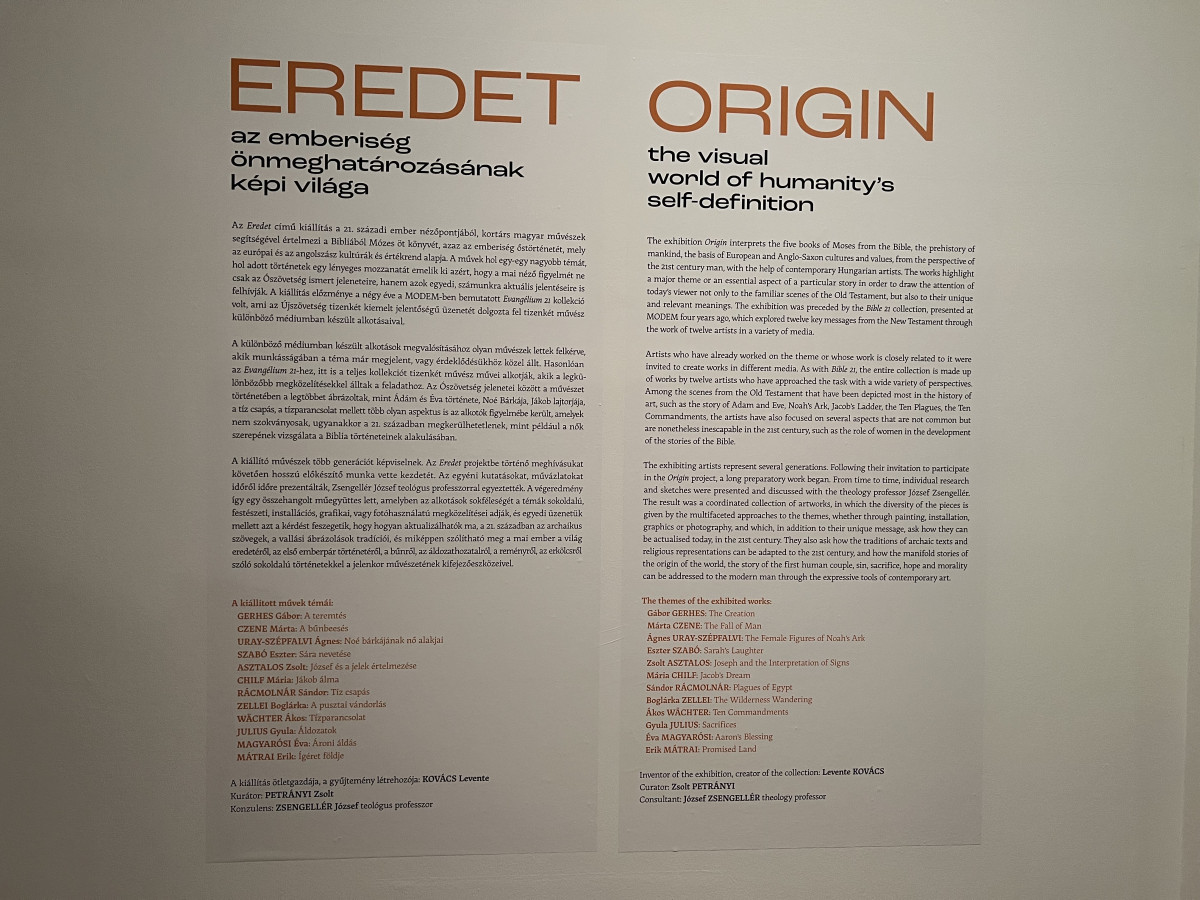 Róma után Magyarországon először Debrecenben, a Modern és Kortárs Művészeti Központban (MODEM) látható szombattól az Eredet című kiállítás, amely 12 kortárs magyar művész Mózes öt könyvéről szóló alkotásait mutatja be.