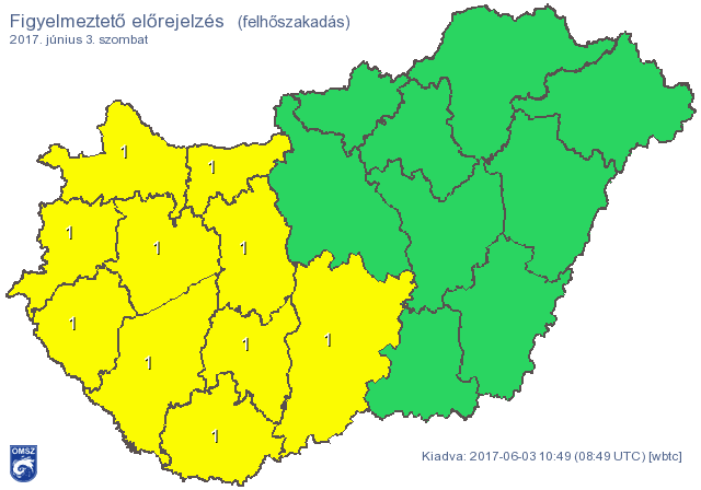 Az ország tíz nyugati megyéjére elsőfokú figyelmeztetést adott ki az Országos Meteorológiai Szolgálat. A dunántúli területeken felhőszakadások várhatóak, az előrejelzés szerint rövid idő alatt 25-40 mm csapadék, vagy még több is lezúdulhat. Jégesőre és viharos szélre is lehet számítani.