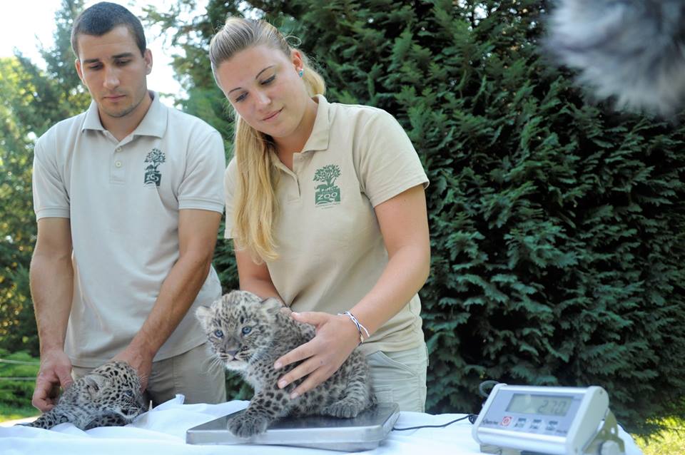 Átestek életük első orvosi vizsgálatán a Nyíregyházi Állatpark egy hónapos perzsa leopárd (Panthera pardus saxicolor) ikrei szerdán.