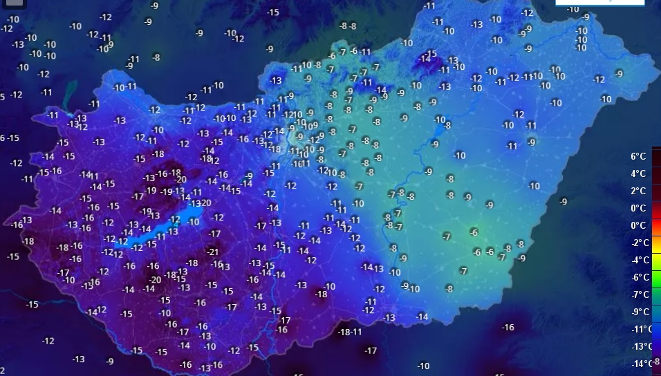 Debrecenben jelenleg -11 fokot mérhetünk, ami hajnalra -13 fokig süllyedhet. Az Időkép szerint (fenti kép) az ország nyugati felében már most -20 fokokat mérnek a fagyzugos helyeken.