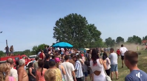 A lap információi szerint az indítás után nem sokkal indult be a lökdösődés az autósok közt, a Lada két sáncon is átcsúszott, és úgy sodródott be a nézők közé.