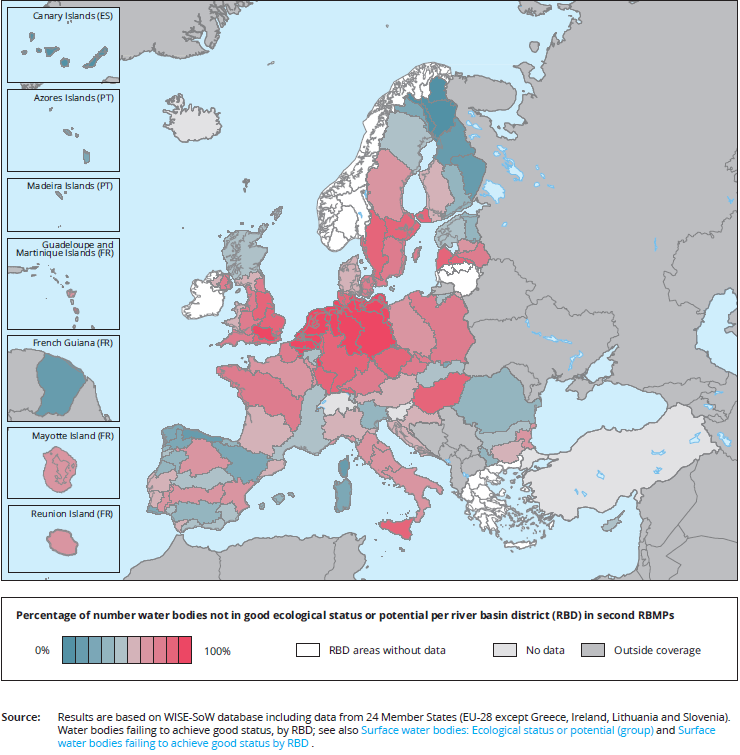 Ökológiai szempontból különösen jó állapotban vannak Skandinávia északi részének, Skóciának, Észtországnak, Szlovákiának, Romániának és egyes földközi-tengeri területeknek a vizei. Rossz állapotban vannak Közép-Európa vízgyűjtőmedencéi, a nagy folyók alsóbb szakaszai – olvasható a jelentésben.