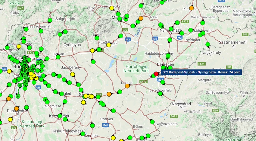 A MÁV valós idejű vonattérképe szerint egy órás és annál nagyobb késések is előfordulnak Budapest és Debrecen között.