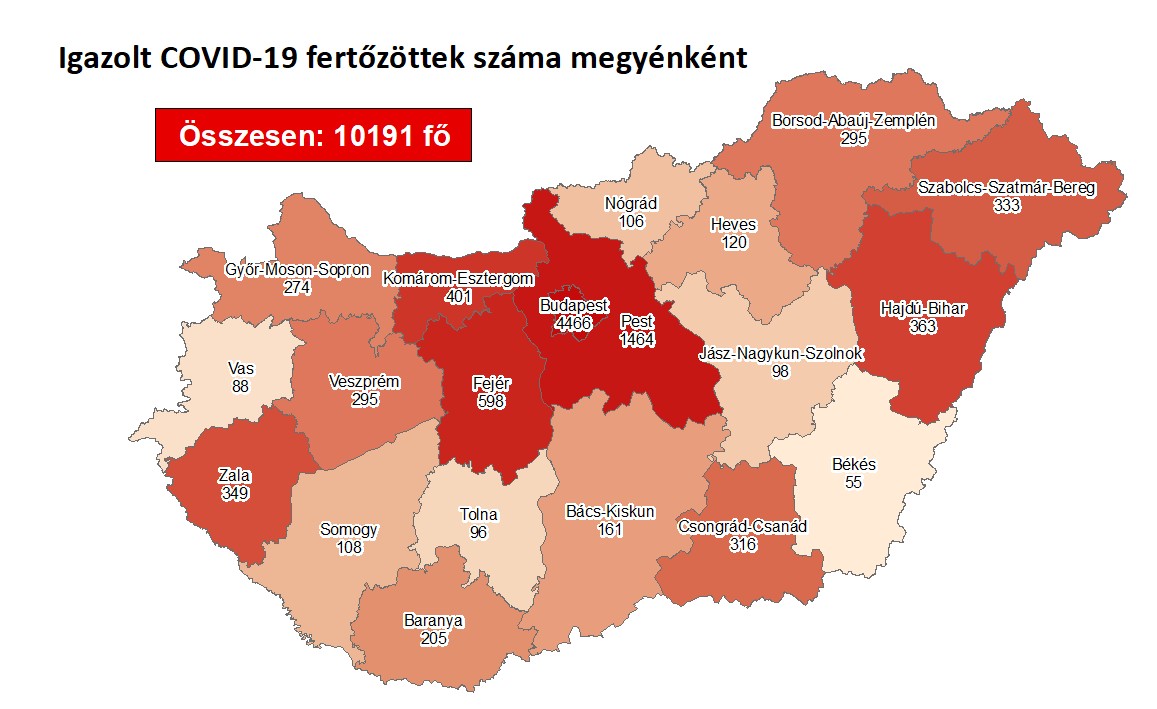 A kormányzati portálon azt írták: 10 191-re nőtt a Magyarországon eddig azonosított fertőzöttek száma. Az elhunytak száma 630-ra emelkedett. 3990-en már meggyógyultak. Az aktív fertőzöttek száma 5571.