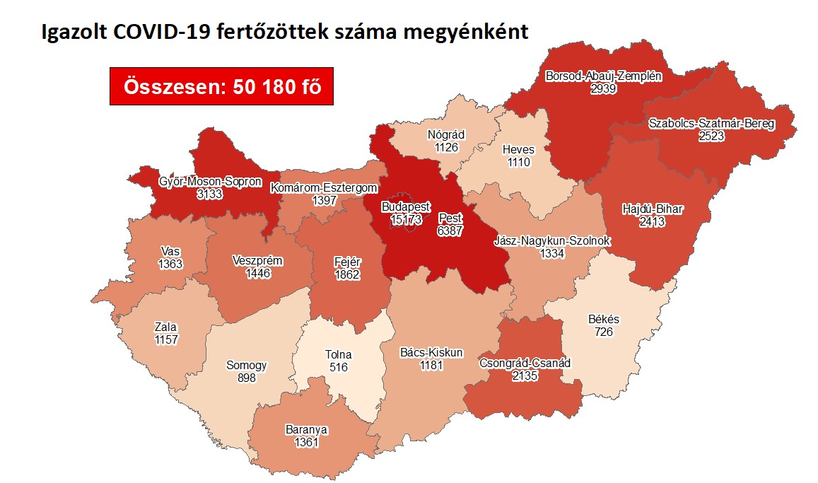 A kormányzati portálon azt írták: 50 180-ra nőtt a Magyarországon azonosított fertőzöttek száma. Az elhunytak száma 1259-re emelkedett, 14 905-en már meggyógyultak.