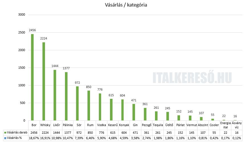 A top 7-es lista élére 13.153 váráslásból 18.6%-kal azaz 2.456 darab vásárlással nem meglepő módon a bor került. A boron belül a száraz borok viszik a megrendelések 2/3 részét.