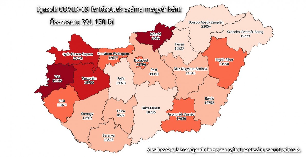 A kormányzati portálon azt írták: 391 170-re nőtt a Magyarországon azonosított fertőzöttek száma. Az elhunytaké 13 931-re emelkedett, a gyógyultak száma 299 989.