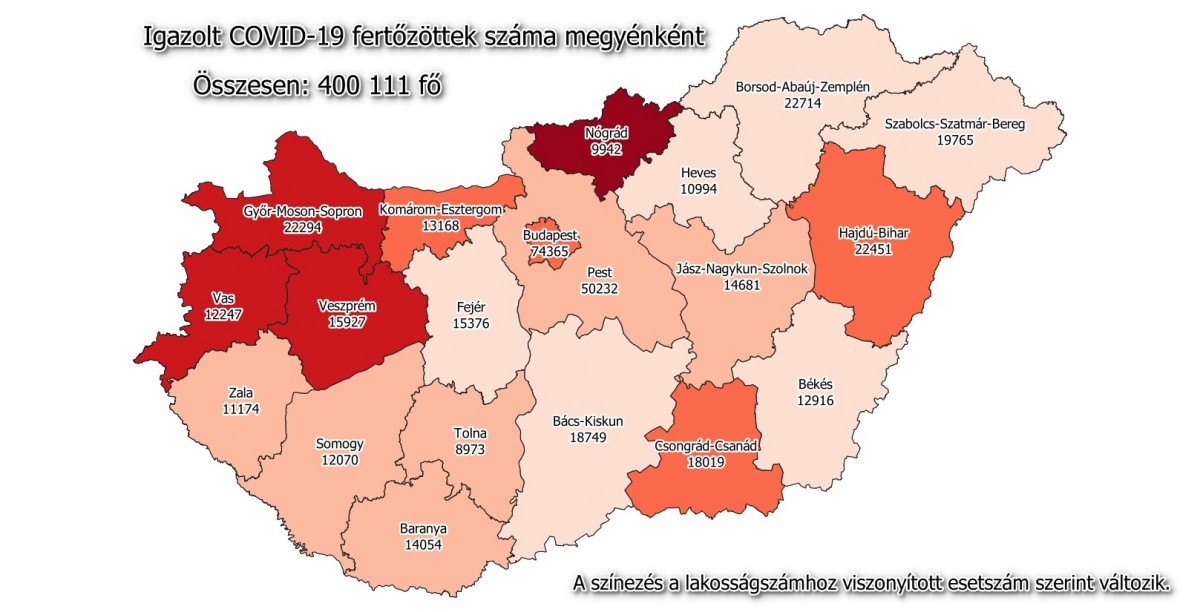 A kormányzati portálon azt írták: 400 111-re nőtt a Magyarországon azonosított fertőzöttek száma. Az elhunytaké 14 252-re emelkedett, a gyógyultak száma 304 680.