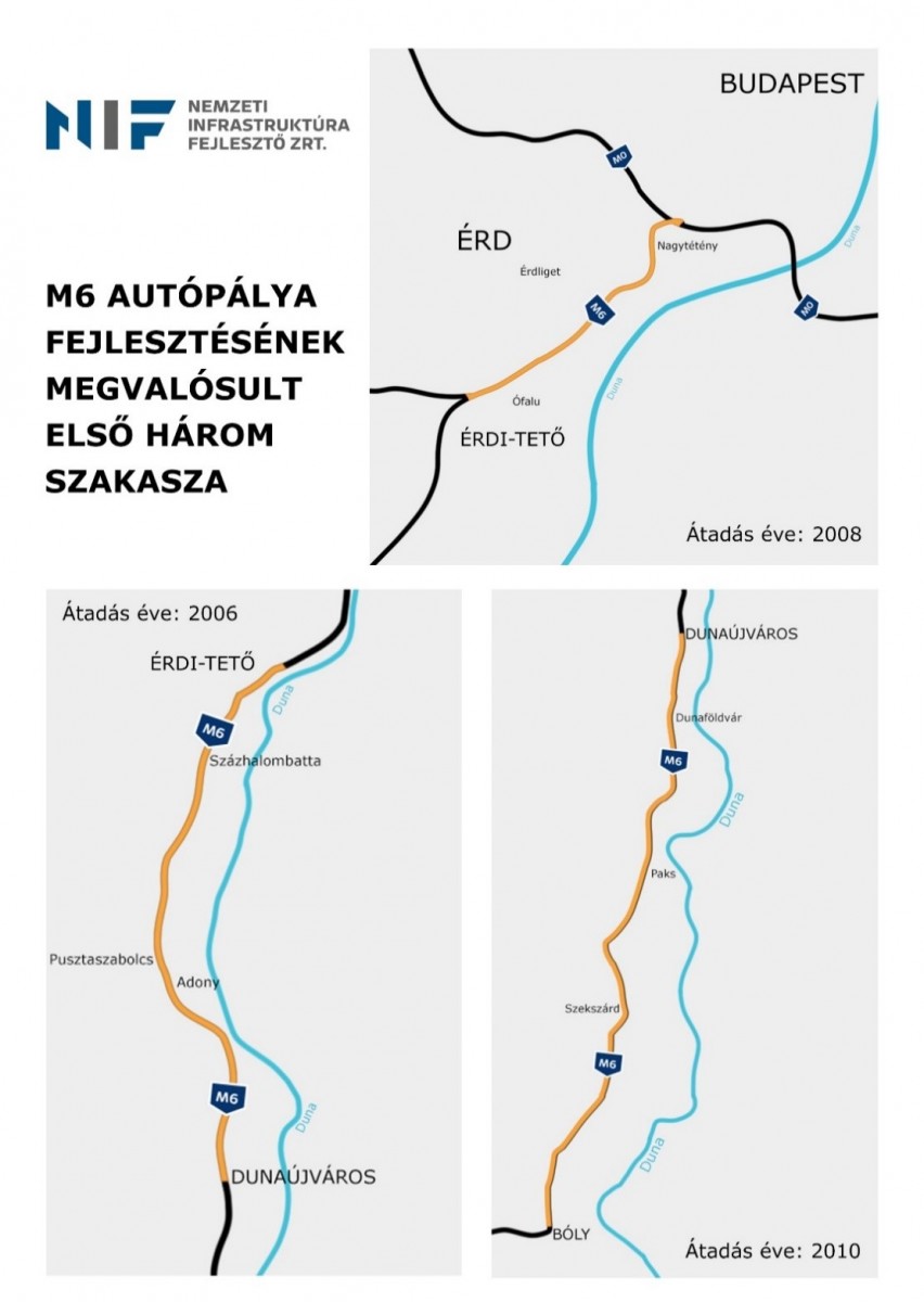 A jelenleg 192 km hosszú M6 autópálya Érdi-tető és Dunaújváros közötti szakaszát 2006-ban adták át a forgalomnak, az M0-s autóút és Érdi-tető közötti szakaszt pedig 2008-ban. A Dunaújváros és Bóly közötti szakasz átadása 2010-ben történt meg.