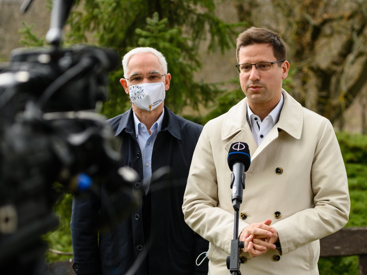 Fotó: Gulyás Gergely Miniszterelnökséget vezető miniszter nyilatkozik a közmédiának Zánkán 2021. április 16-án. Mellette Balog Zoltán református püspök (b). A miniszter bejelentette, hogy a történelmi keresztény egyházak kérésének megfelelően a papok, lelkészek is megkapják a koronavírus elleni oltást, mivel kiemelkedő szerepet játszanak ebben a nehéz időszakban. MTI/Vasvári Tamás