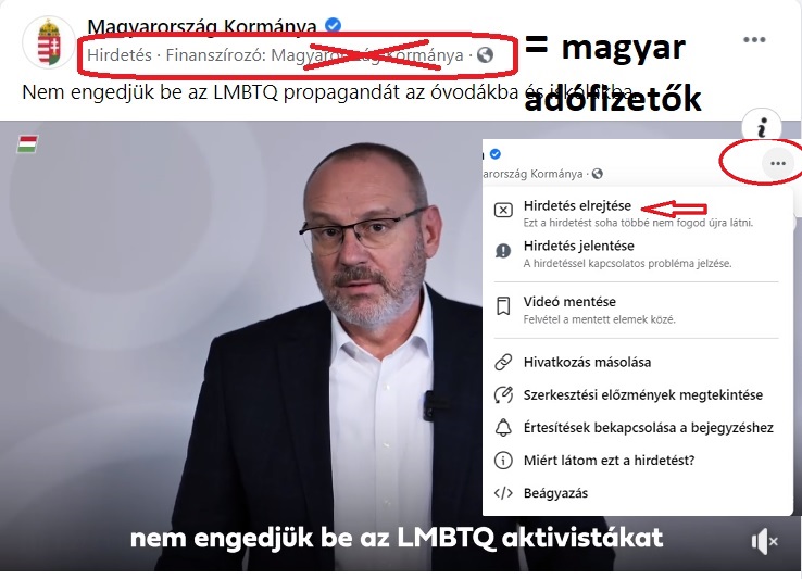 Végül az alább megjelenő panelen nyomjon a “Magyarország Kormánya hirdetések elrejtése” menüpontra, esetleg még indokolhatja is döntését, és készen is vagyunk.