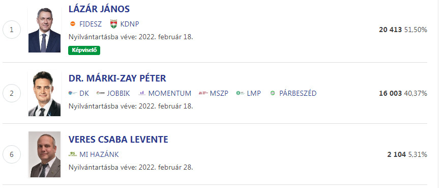 1. LÁZÁR JÁNOS (FIDESZ-KDNP) – 52,16 százalék, 14 420 szavazat