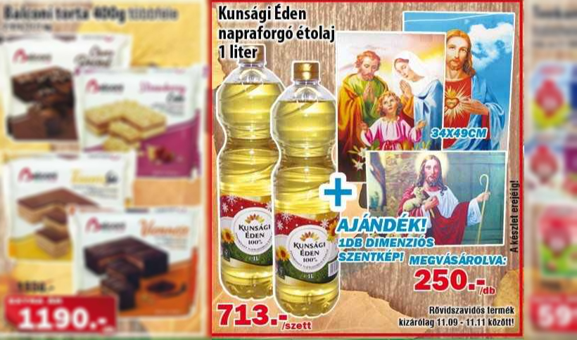 A piros keretben lévő akcióban két liter olaj mellé egy 34×49-es „dimenziós” szentképet adnak 250 forint helyett ingyen.