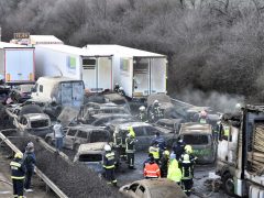 A rendőrség közleménye szerint a baleset elhunytjára az autóroncsok eltávolítása során találtak rá. A helyszíni szemle jelenleg is folyamatban van. A rendőrség korábbi közlése szerint öt kamion és 37 autó ütközött össze az M1-es autópálya 26-os kilométerszelvényénél, a fővárosból kifelé vezető oldalon. Az elsődleges adatok alapján a balesetben érintett öt kamion és 37 személygépkocsi közül 19 jármű kiégett.