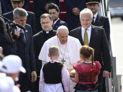 A repülőtéren száz gyerek is várta Ferenc pápát, közülük két, magyar népviseletbe öltözött gyerek kenyeret és sót adott át neki; a szentatya evett is a kínált kenyérből.