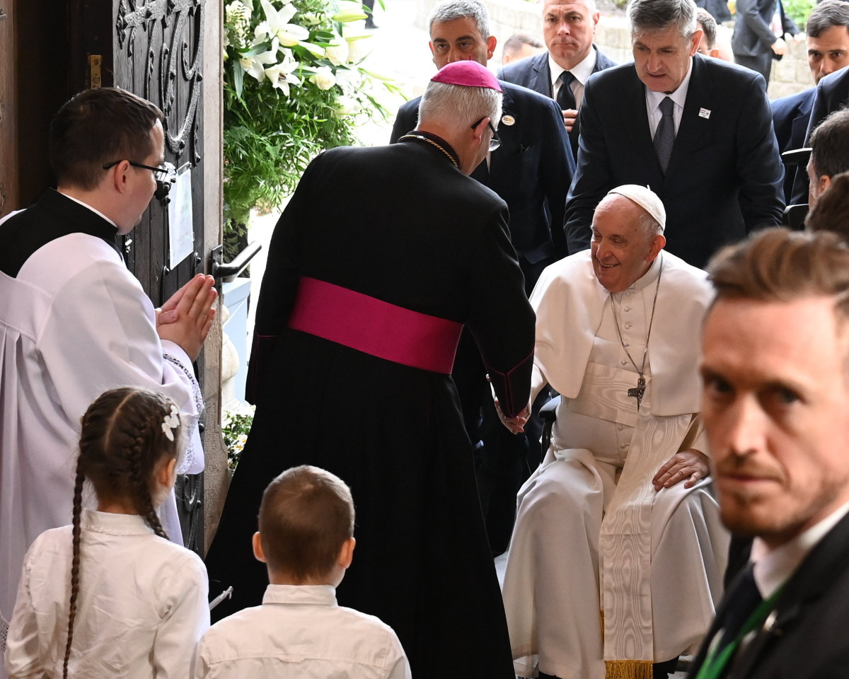 Ferenc pápa a közeli Árpád-házi Szent Erzsébet-templomból kerekesszékben érkezett a görögkatolikus közösség templomába, ahol Kocsis Fülöp hajdúdorogi görögkatolikus érsek-metropolita fogadta. A hívek Ferenc pápa érkezése előtt már elkezdték énekelni az akathisztoszt, az Istenszülő Szűz Máriát dicsőítő himnuszt, amit a pápa érkezésekor megszakítottak.