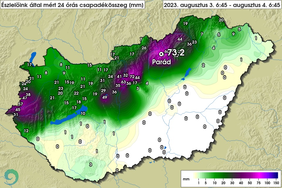Az éjszaka a legtöbb eső a Mátrában esett, a meteorológiai szolgálat automatája Gyöngyössolymoson 73,8 milliméter, egy megfigyelő pedig Parádon 73,2 milliméter csapadékot mért. A fővárosban a legtöbb csapadékot, 63 millimétert Kelenföldön mérték – tették hozzá.