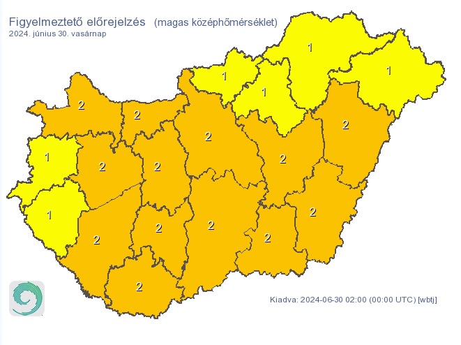 Figyelmeztető előrejelzés Magyarország területére 2024.06.30. vasárnap éjfélig