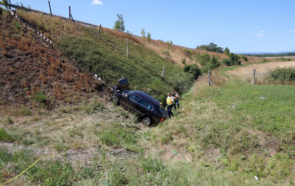 Rendõrök helyszínelnek egy összeroncsolódott személygépkocsinál, miután az autó az M3-ason Mezõkövesd és Mezõkeresztes között nem tartott megfelelõ követési távolságot, és az elõtte haladó jármûnek nekiütközött, majd az árokba sodródott 2024. július 30-án. A gépkocsiban utazó három ember a helyszínen meghalt.