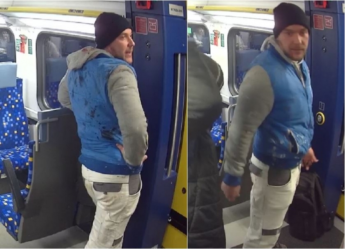 A képeken látható, egyelőre ismeretlen személyazonosságú férfi 2021. február 19-én 19 óra körüli időben a Budapest, Nyugati pályaudvar – Vác között közlekedő vonatszerelvényen snicerrel a kezében trágár kifejezésekkel illette, majd bántalmazta egy utastársát.
