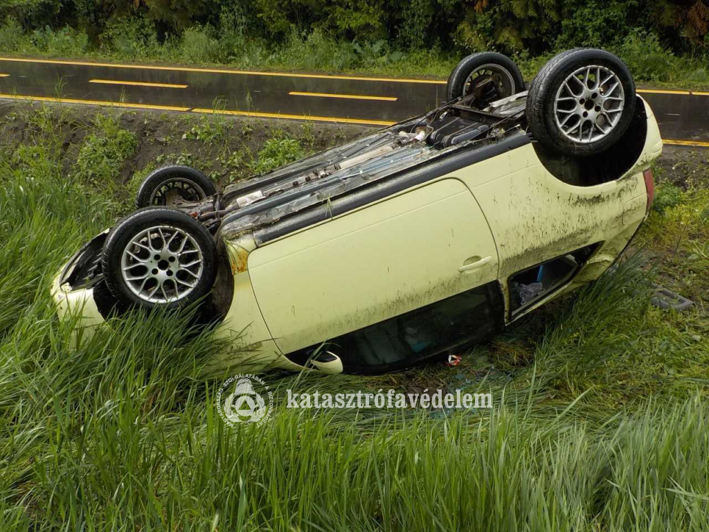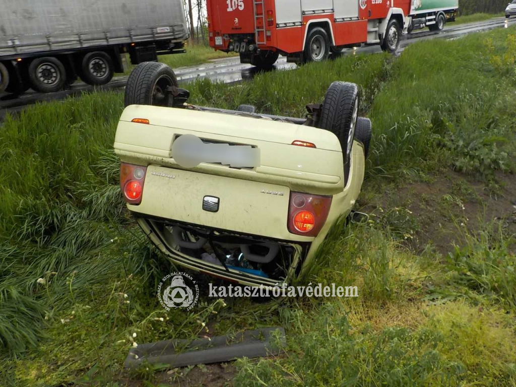 Lesodródott az útról, árokba hajtott és felborult egy személygépkocsi hétfőn délután a 441-es főút 5-ös kilométerénél, Cegléd közelében.