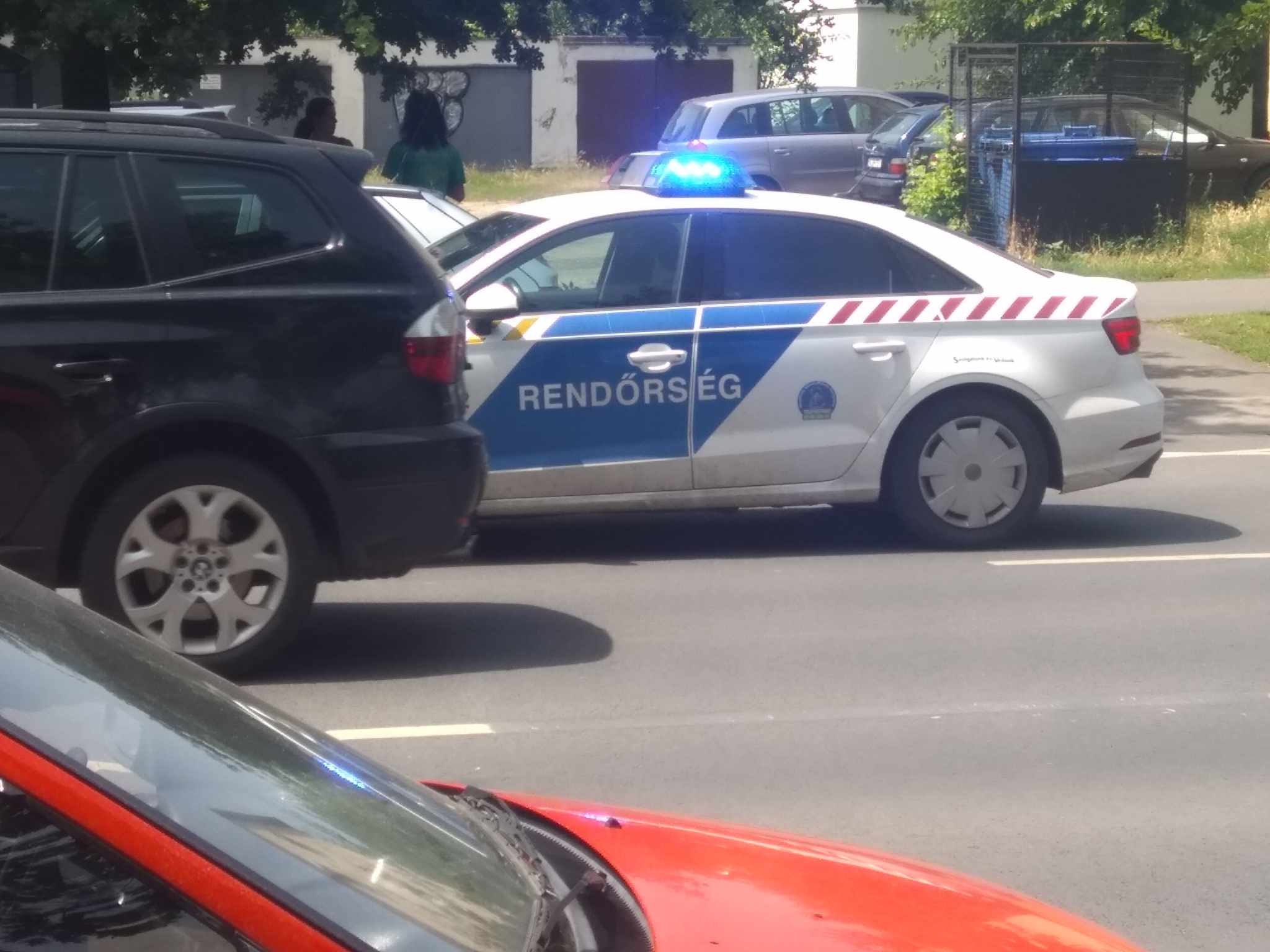 A rendőrség két autóval érkezett a helyszínre, a forgalom félpályán halad.