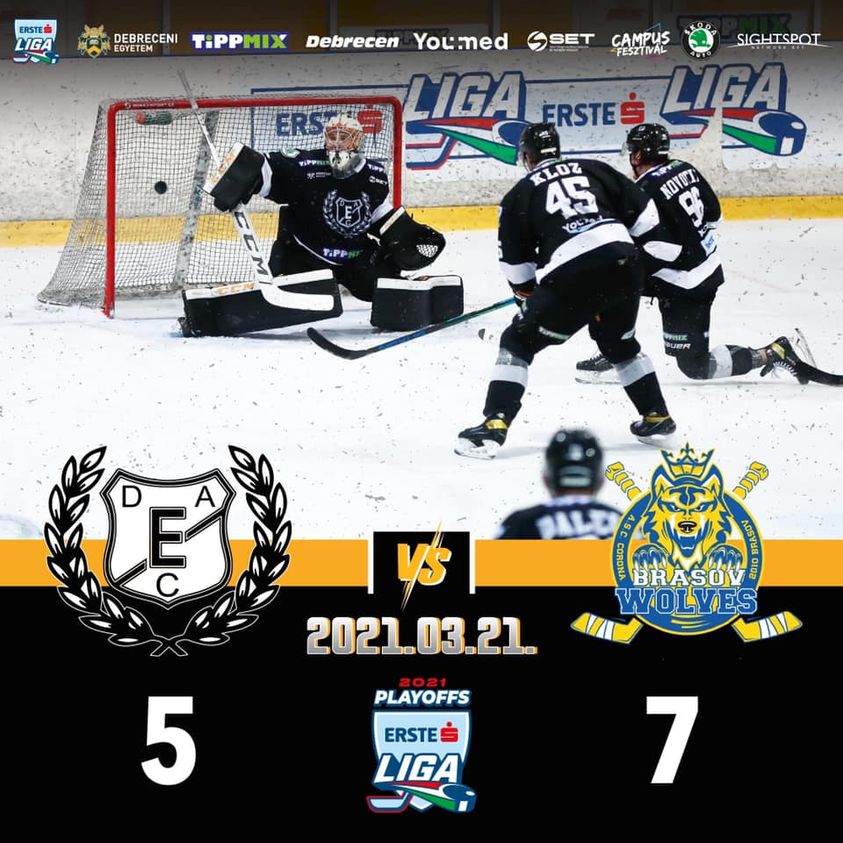 Ezúttal villámgyors gólváltással indult a magas iramú találkozó: a Wolves vezetése után a harmadik percben 1-1-et mutatott az eredményjelző, majd Hári Norbert buli utáni találatával már a DEAC vezetett. Ezúttal a brassóiak egyenlítettek rövid időn belül, a játékrész hajrájában azonban gyors egymásutánban lőtt két gól nyomán magabiztos debreceni előnnyel vonulhattak pihenni a csapatok.