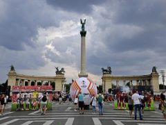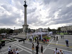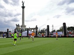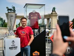 Budapest láthatóan megélénkült, az Európa-liga-trófeával fényképezkedtek szurkolók a labdarúgó a döntő előtt a budapesti Hősök terén felépített szurkolói zónában, de az erre az alkalomra felépített műfüves pályán labdás testmozgás is volt.