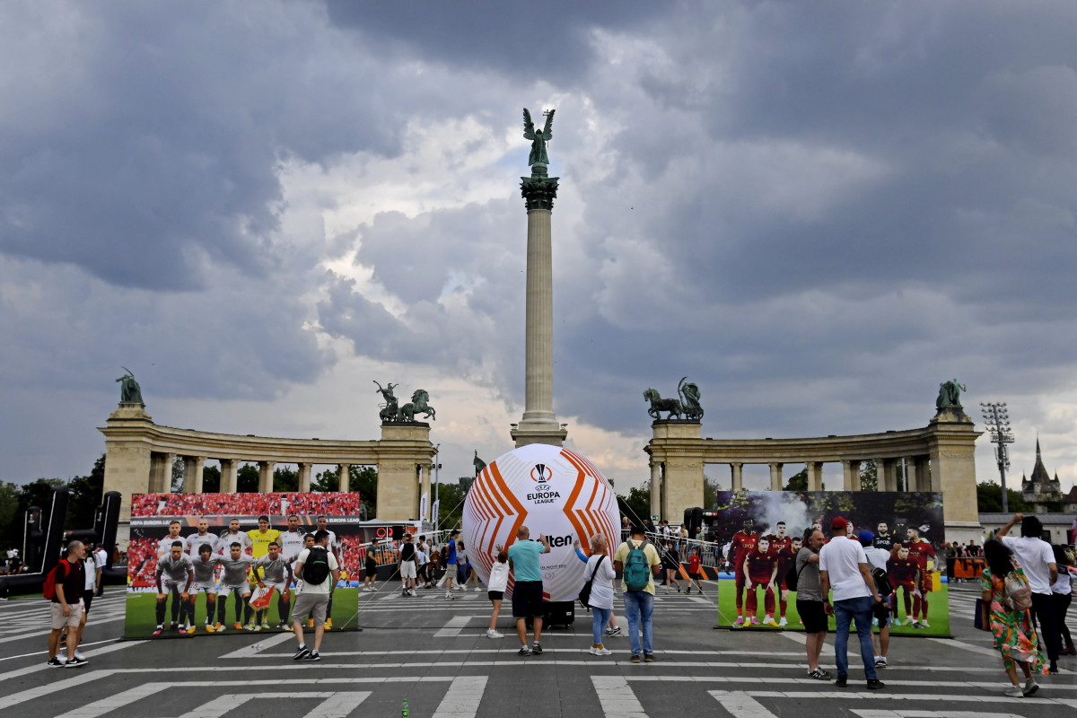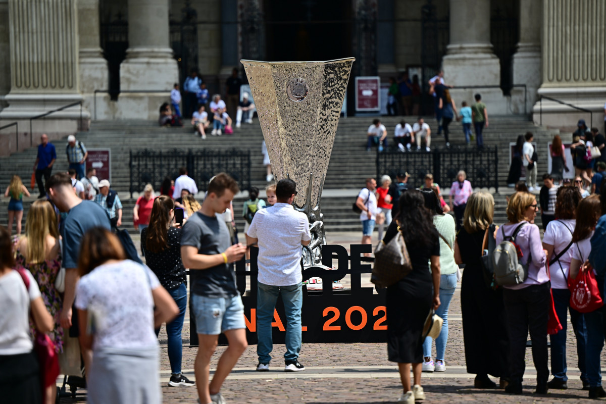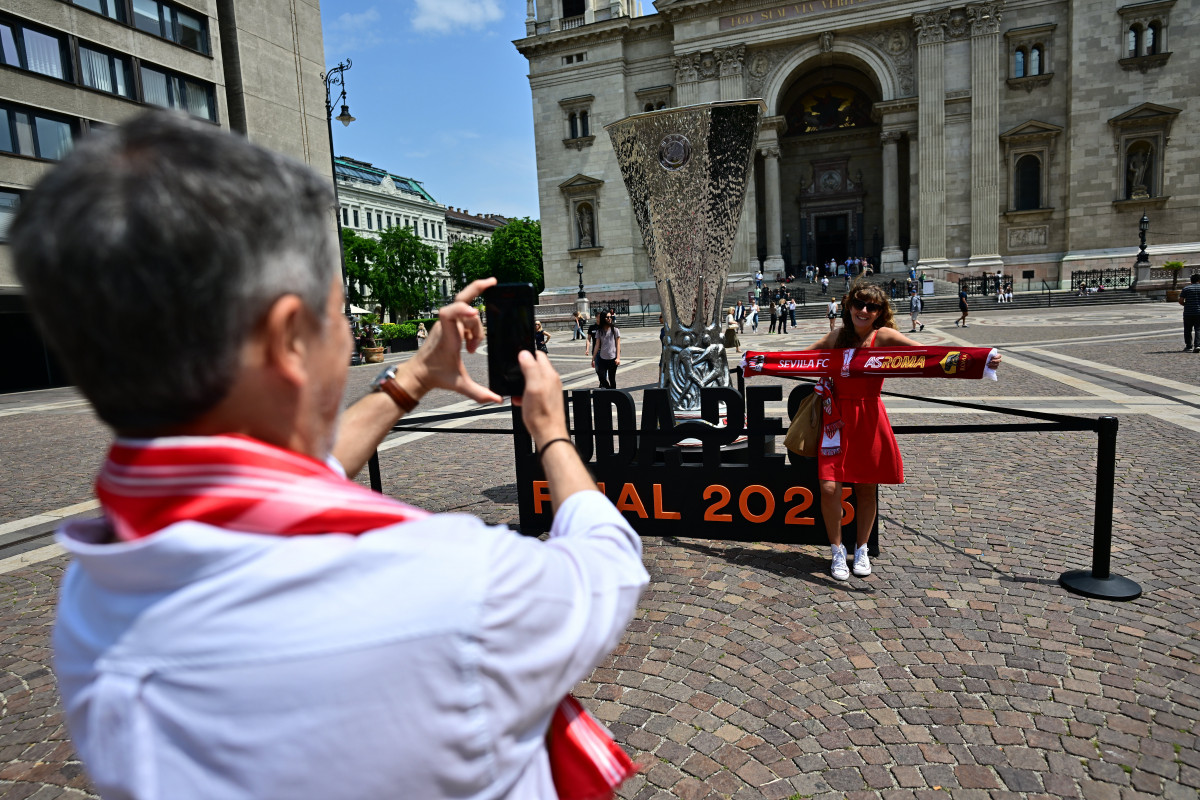 Budapest láthatóan megélénkült, az Európa-liga-trófeával fényképezkedtek szurkolók a labdarúgó a döntő előtt a budapesti Hősök terén felépített szurkolói zónában, de az erre az alkalomra felépített műfüves pályán labdás testmozgás is volt.