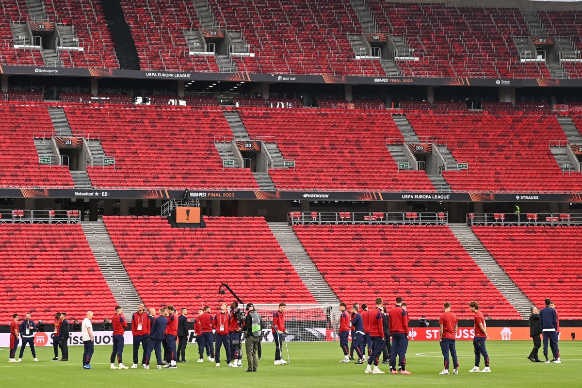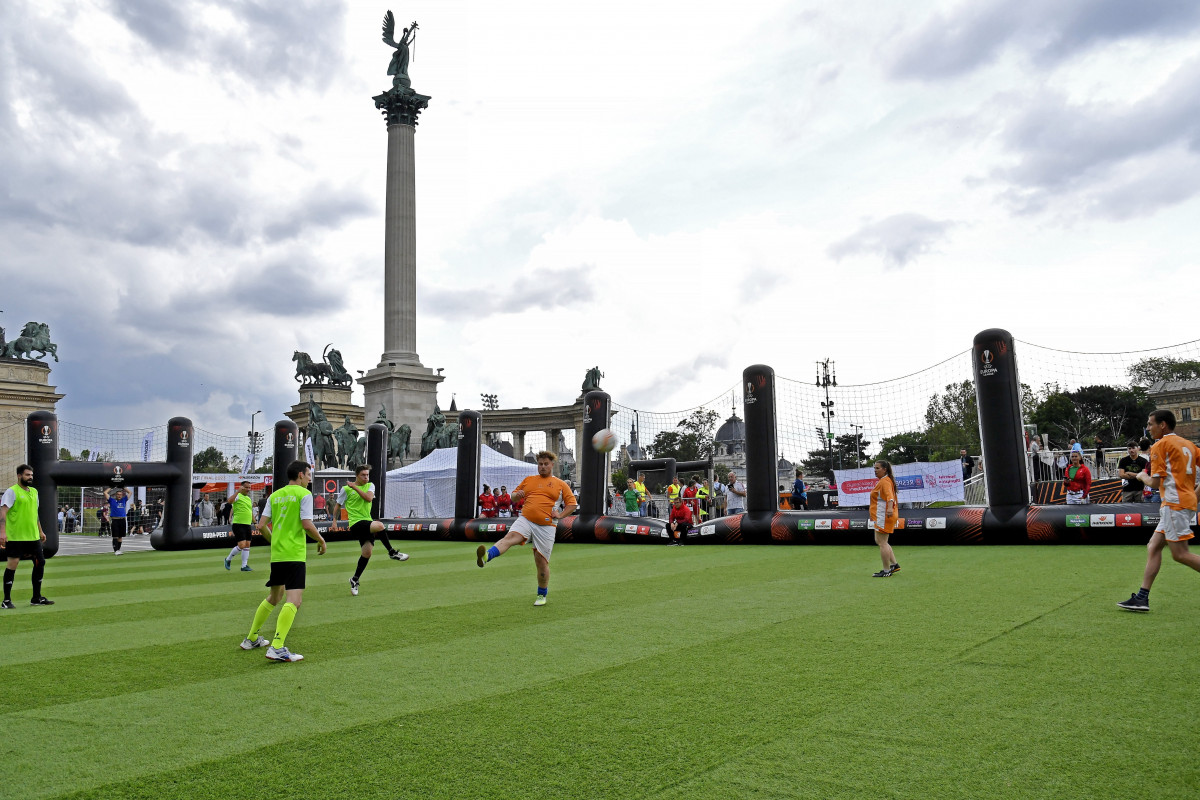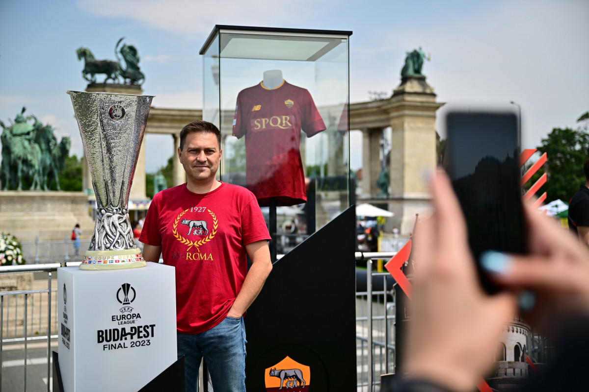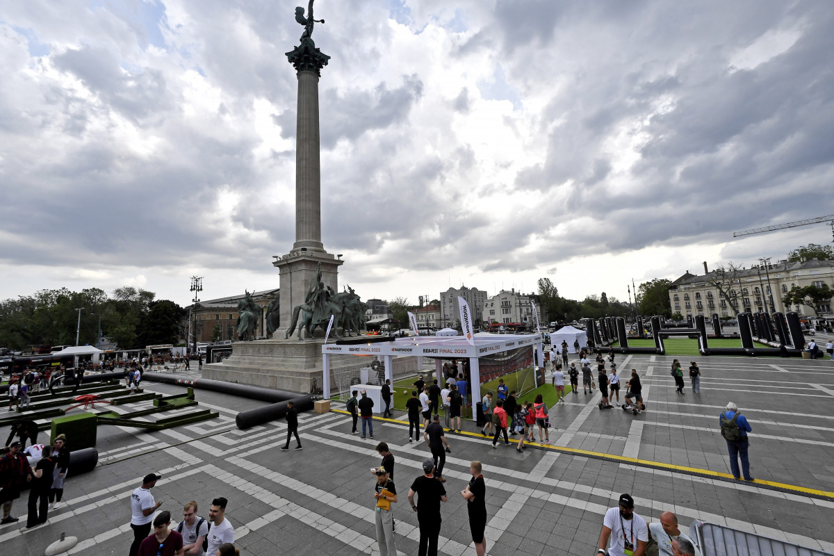 Budapest láthatóan megélénkült, az Európa-liga-trófeával fényképezkedtek szurkolók a labdarúgó a döntő előtt a budapesti Hősök terén felépített szurkolói zónában, de az erre az alkalomra felépített műfüves pályán labdás testmozgás is volt.