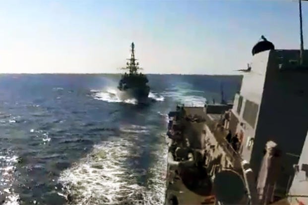 A katonai ügyek moszkvai minisztériuma ezzel szemben azt állította, hogy az amerikai romboló keresztezte az orosz hajó haladási irányát az Arab-tengeren és hogy az amerikai legénység szakszerűtlenül cselekedett. A tárca rámutatott, hogy a hajók tengeri összeütközésének megelőzésének nemzetközi szabályait rögzítő 1972-es konvenció értelmében az útvonalak kereszteződése esetén annak a hajónak kell utat engednie, amely jobb felől akadályoztatott.