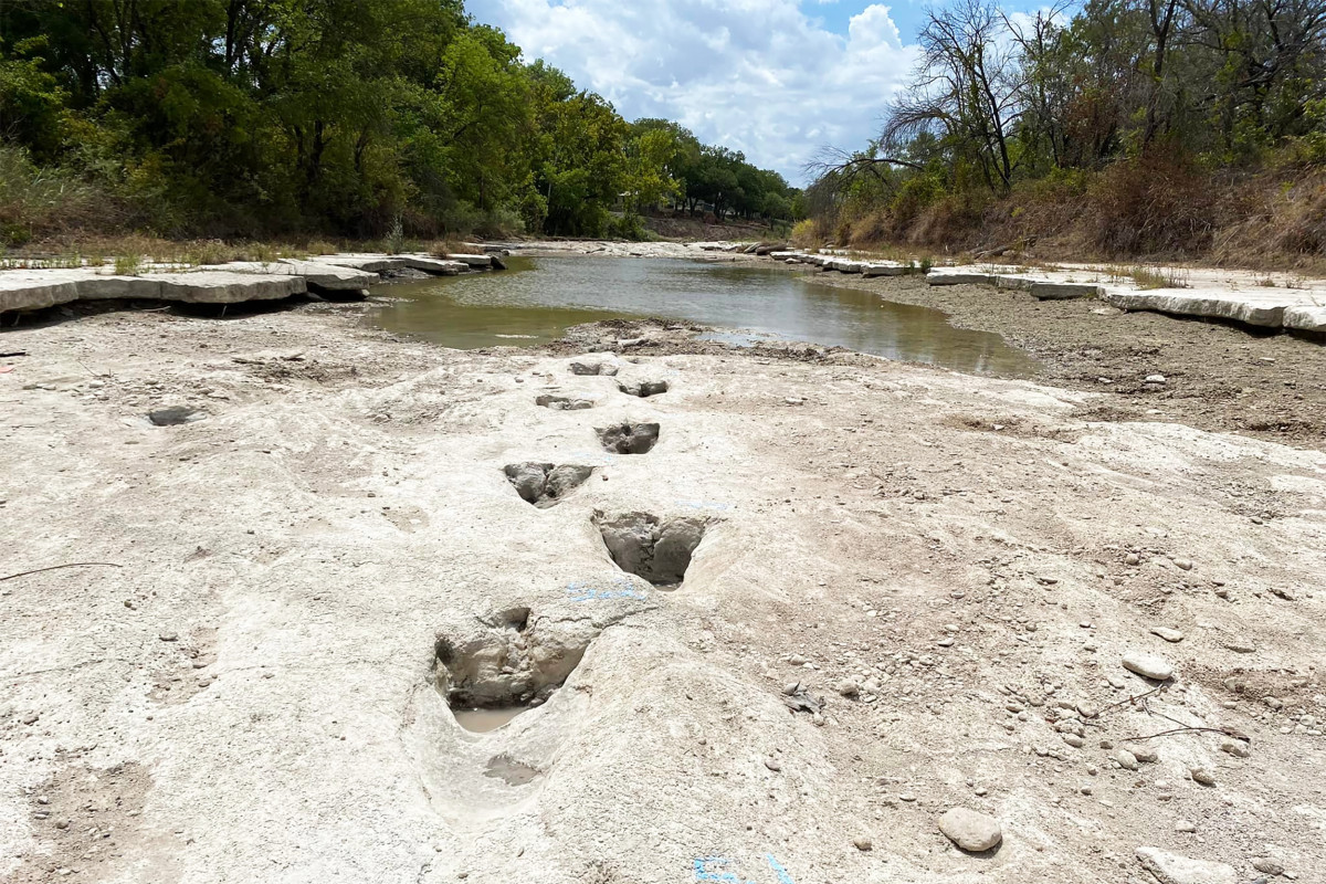 Egy kiszáradt folyómederben találtak rá a háromszög formájú, gigantikus méretű lábnyomokra a Dinoszaurusz Völgynek nevezett texasi nemzeti parkban.